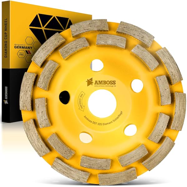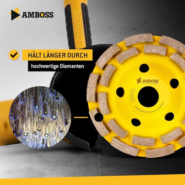 Dieser Premium-Schleifteller von AMBOSS bietet durch seine zweireihigen Blocksegmente eine herausragende Performance bei Standard-Schleifarbeiten und überzeugt als wahrer Allrounder. Die lasergeschweißten, 5 mm hohen Diamantsegmente garantieren eine exzellente Standzeit und höchste Zuverlässigkeit selbst bei intensivem Einsatz auf sehr harten und abrasiven Materialien. Dank der integrierten 5 Absauglöcher wird der Materialabtrag schnell entfernt, was ein effizientes und sauberes Arbeiten ermöglicht. Vielseitig einsetzbar zum Nivellieren, Abtragen, Reinigen und Entfernen auf Beton, Putz, Estrich und Fliesenkleber.