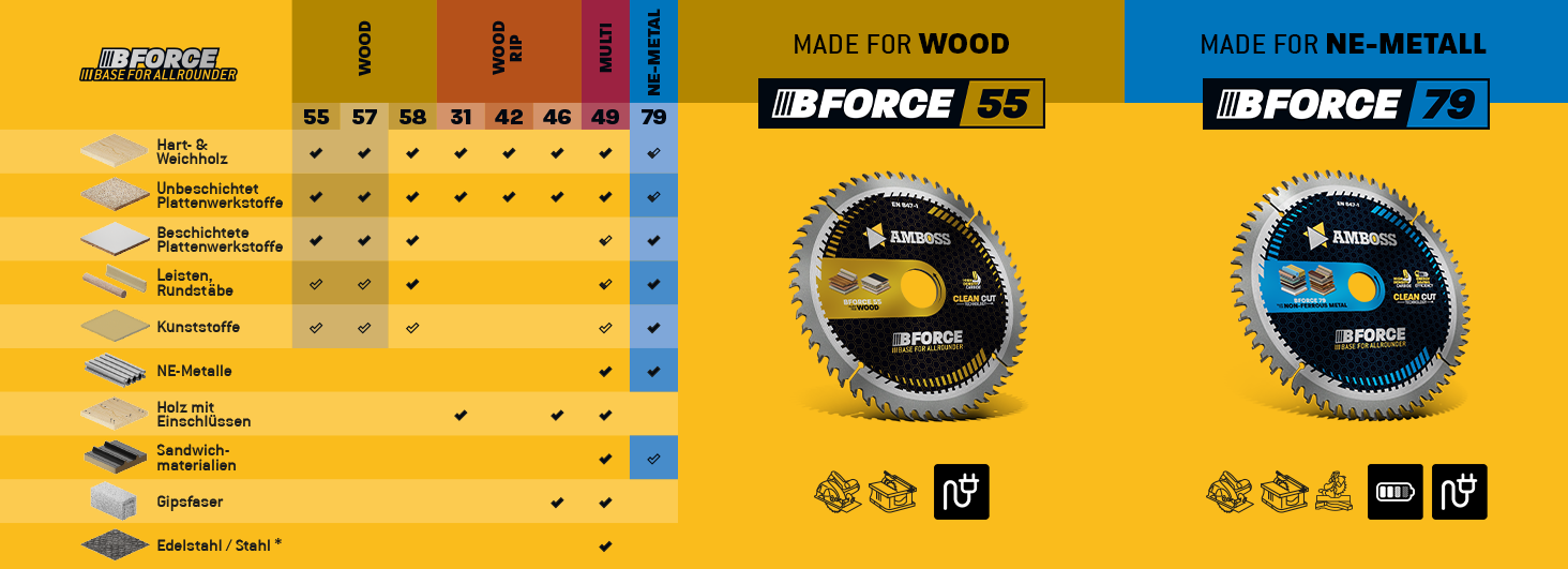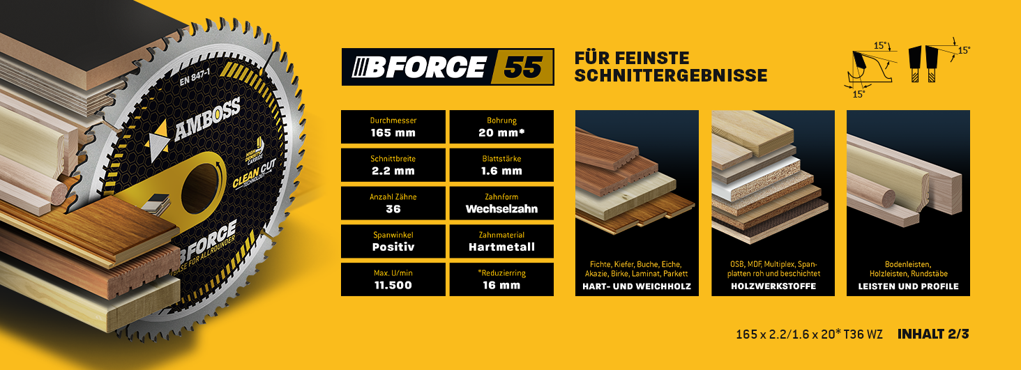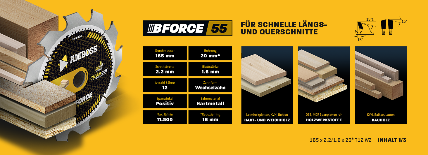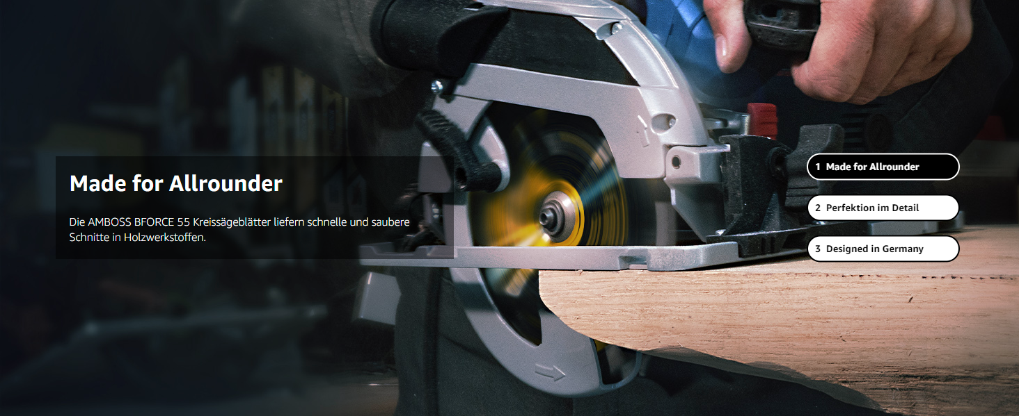 Die Kreissägeblatt-Sets von Amboss sind vielseitig einsetzbar und eignen sich ideal für das Schneiden von Holz, Holzwerkstoffen, beschichteten Platten, Ne-Metallen wie Aluminium und Kunststoffen. Diese Sets ermöglichen sowohl schnelle grobe als auch feine Schnitte und bestehen jeweils aus drei Sägeblättern mit grober, mittlerer und feiner Verzahnung. Sie sind kompatibel mit gängigen Akku Hand- und Tischkreissägen von Herstellern wie Bosch, Festool, Mafell, Dewalt und vielen anderen
