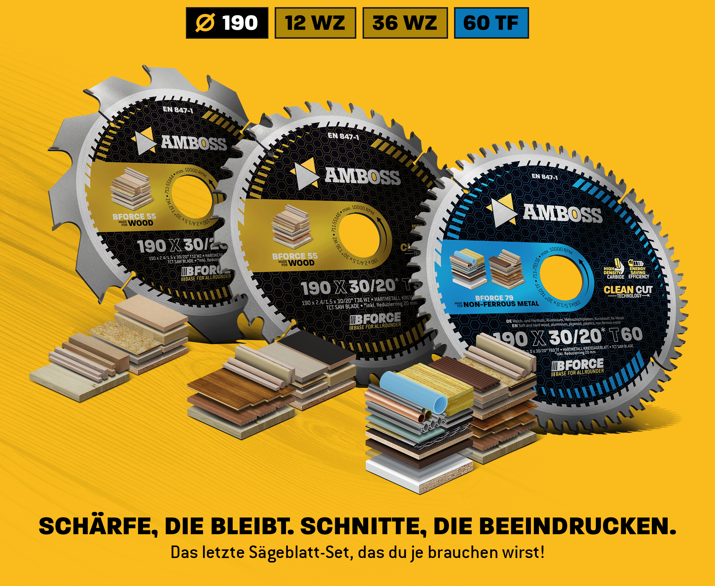 Die Kreissägeblatt-Sets von Amboss sind vielseitig einsetzbar und eignen sich ideal für das Schneiden von Holz, Holzwerkstoffen, beschichteten Platten, Ne-Metallen wie Aluminium und Kunststoffen. Diese Sets ermöglichen sowohl schnelle grobe als auch feine Schnitte und bestehen jeweils aus drei Sägeblättern mit grober, mittlerer und feiner Verzahnung. Sie sind kompatibel mit gängigen Akku Hand- und Tischkreissägen von Herstellern wie Bosch, Festool, Mafell, Dewalt und vielen anderen