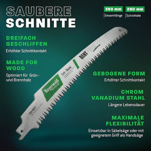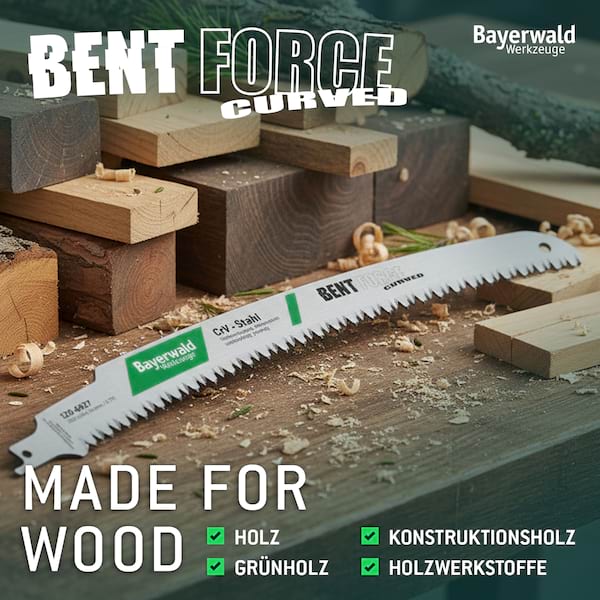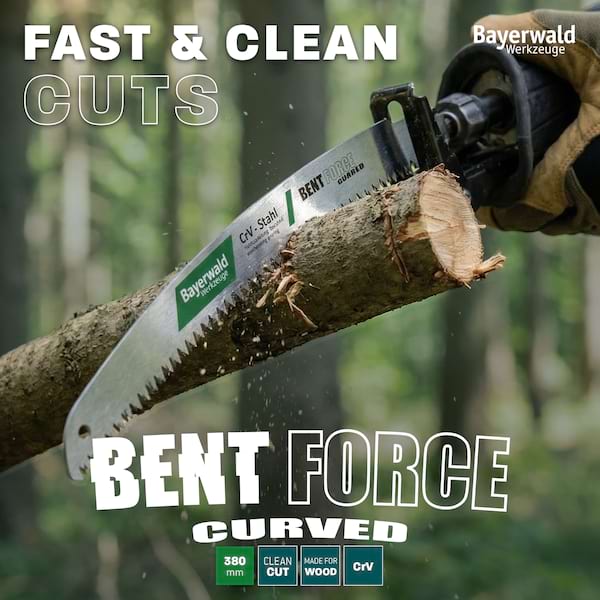 Die Bayerwald Säbelsägeblätter mit präziser Japanzahnung sind die ideale Wahl für saubere, exakte Schnitte in Holz und Holzwerkstoffen. Die feingeschliffene Zahnung sorgt für ausrissarme Schnittkanten und ermöglicht ein müheloses Arbeiten mit hoher Kontrolle. Durch die gebogene Form und den dreifachen Schliff bleibt der Schnittkontakt konstant – für besonders effiziente Sägeleistung. Gefertigt aus robustem Chrom-Vanadium-Stahl bieten die Blätter eine hervorragende Standzeit, hohe Flexibilität und dauerhaft präzise Ergebnisse. Sie sind sowohl in der Säbelsäge als auch mit geeignetem Handgriff vielseitig einsetzbar – perfekt für den professionellen und anspruchsvollen Einsatz im Holzbereich.