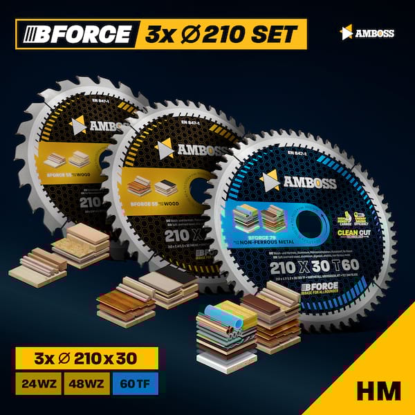 Die Kreissägeblatt-Sets von Amboss sind vielseitig einsetzbar und eignen sich ideal für das Schneiden von Holz, Holzwerkstoffen, beschichteten Platten, Ne-Metallen wie Aluminium und Kunststoffen. Diese Sets ermöglichen sowohl schnelle grobe als auch feine Schnitte und bestehen jeweils aus drei Sägeblättern mit grober, mittlerer und feiner Verzahnung. Sie sind kompatibel mit gängigen Akku Hand- und Tischkreissägen von Herstellern wie Bosch, Festool, Mafell, Dewalt und vielen anderen