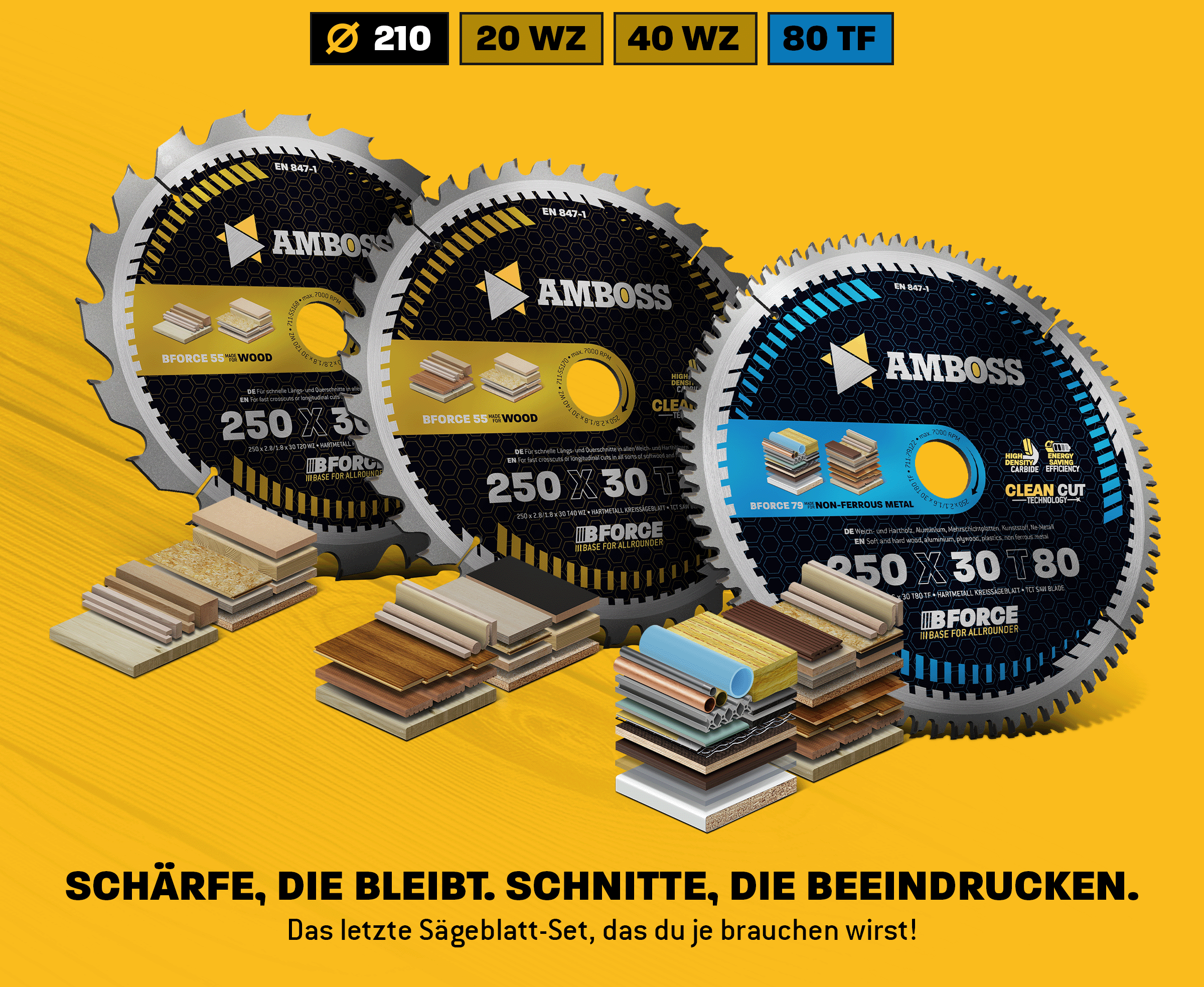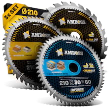 Die Kreissägeblatt-Sets von Amboss sind vielseitig einsetzbar und eignen sich ideal für das Schneiden von Holz, Holzwerkstoffen, beschichteten Platten, Ne-Metallen wie Aluminium und Kunststoffen. Diese Sets ermöglichen sowohl schnelle grobe als auch feine Schnitte und bestehen jeweils aus drei Sägeblättern mit grober, mittlerer und feiner Verzahnung. Sie sind kompatibel mit gängigen Akku Hand- und Tischkreissägen von Herstellern wie Bosch, Festool, Mafell, Dewalt und vielen anderen