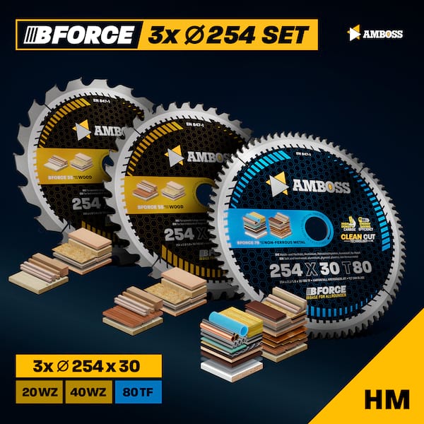 Die Kreissägeblatt-Sets von Amboss sind vielseitig einsetzbar und eignen sich ideal für das Schneiden von Holz, Holzwerkstoffen, beschichteten Platten, Ne-Metallen wie Aluminium und Kunststoffen. Diese Sets ermöglichen sowohl schnelle grobe als auch feine Schnitte und bestehen jeweils aus drei Sägeblättern mit grober, mittlerer und feiner Verzahnung. Sie sind kompatibel mit gängigen Akku Hand- und Tischkreissägen von Herstellern wie Bosch, Festool, Mafell, Dewalt und vielen anderen