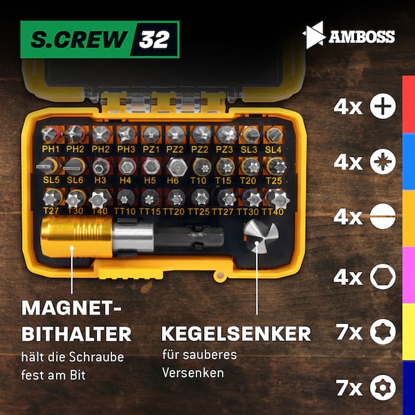 Amboss S.CREW 32 – 32-teiliges Bitset mit HSS-Kegelsenker & Magnetbithalter.