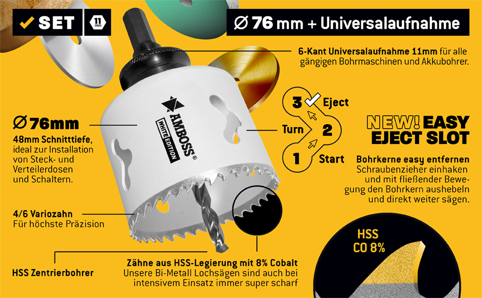Genau dann, wenn es auf Präzision und saubere Schnittkanten ankommt schlägt die Stunde der Amboss M42 Profi Lochsäge. Mit ihr kann von Stahl über Bunt- und Leichtmetalle bis hin zu Gipskarton oder Holz mit Nägeln eine große Zahl an Werkstoffen bearbeitet werden.
