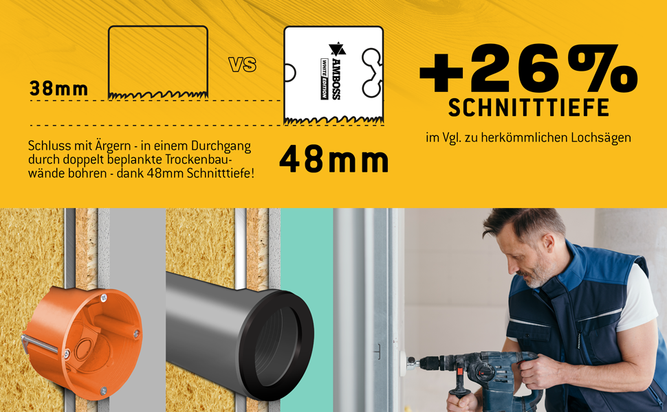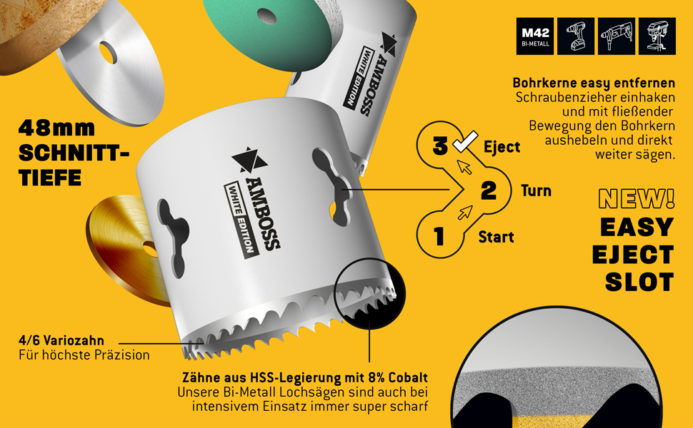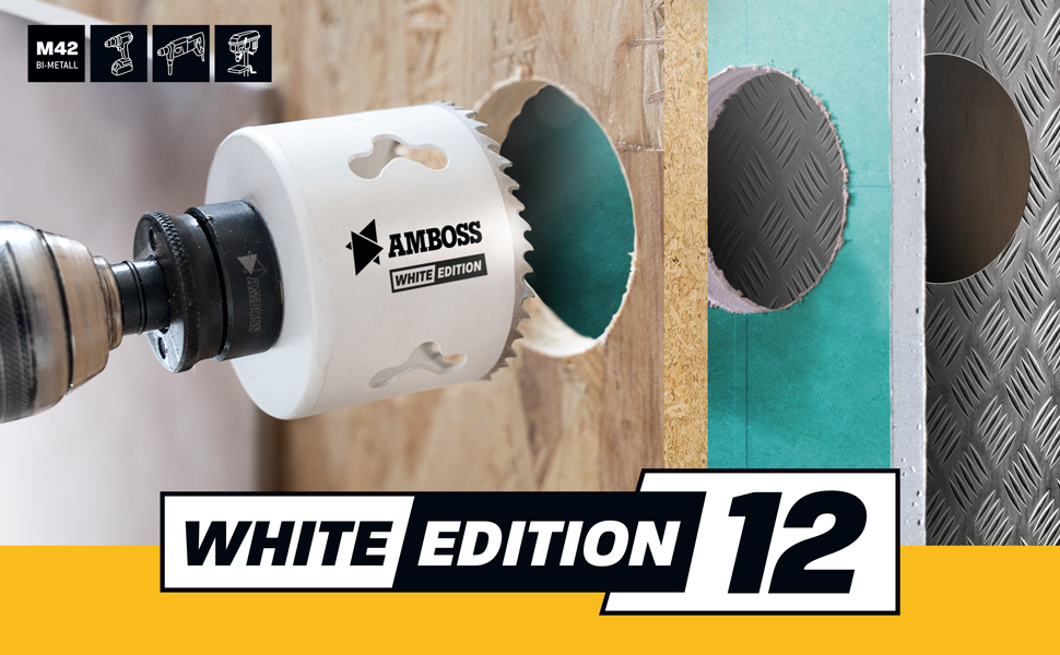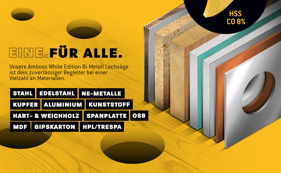 Mit der Amboss White Edition sind Sie perfekt für die professionelle Bearbeitung von Metallen, Aluminium, rostfreiem Edelstahl sowie Kunststoffen und Holz gerüstet. Der Cobaltanteilt von 8% sorgt für eine hohe Widerstandsfähigkeit und lange Standzeit. Die variable Zahnteilung von 4/6 ZpZ ermöglicht ein sauberes, schnelles Arbeiten ohne Verhaken. Dabei besticht die Schnitttiefe von 48mm durch ihre vielfältigen Einsatzmöglichkeiten.