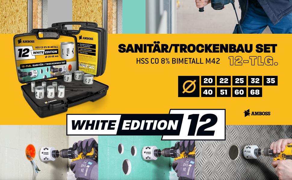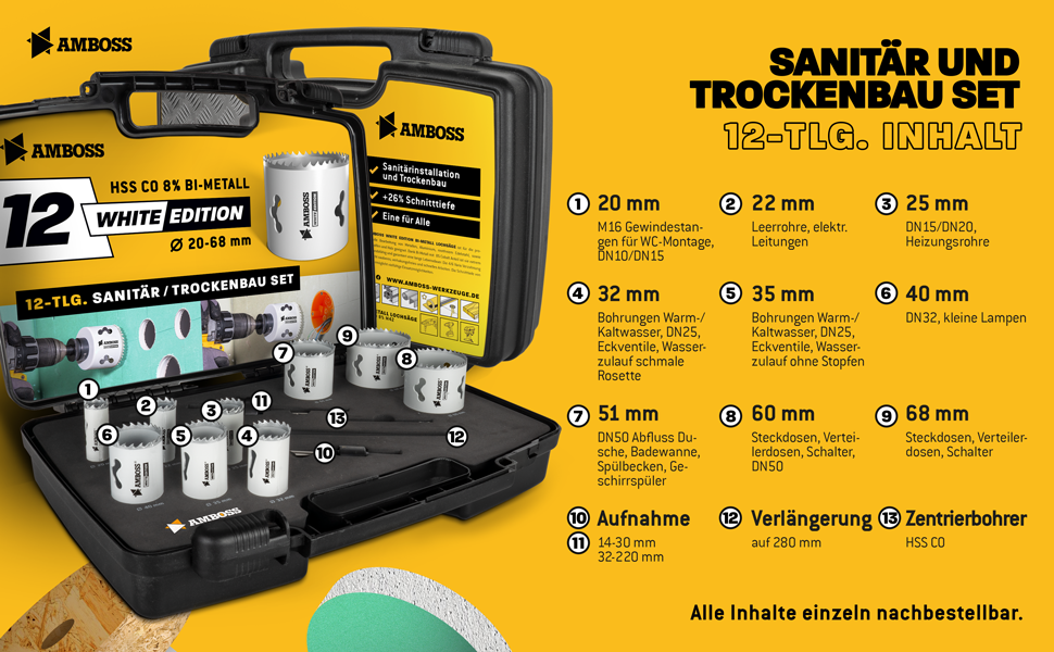 Das Set White Edition 12 umfasst die Lochsägen-Durchmesser 20, 22, 25, 32, 35, 40, 51, 60 und 68 mm sowie 2 passende Standard-Aufnahmen für die verschiedenen Durchmesser, einen HSS-Zentrierbohrer und eine Verlängerung.