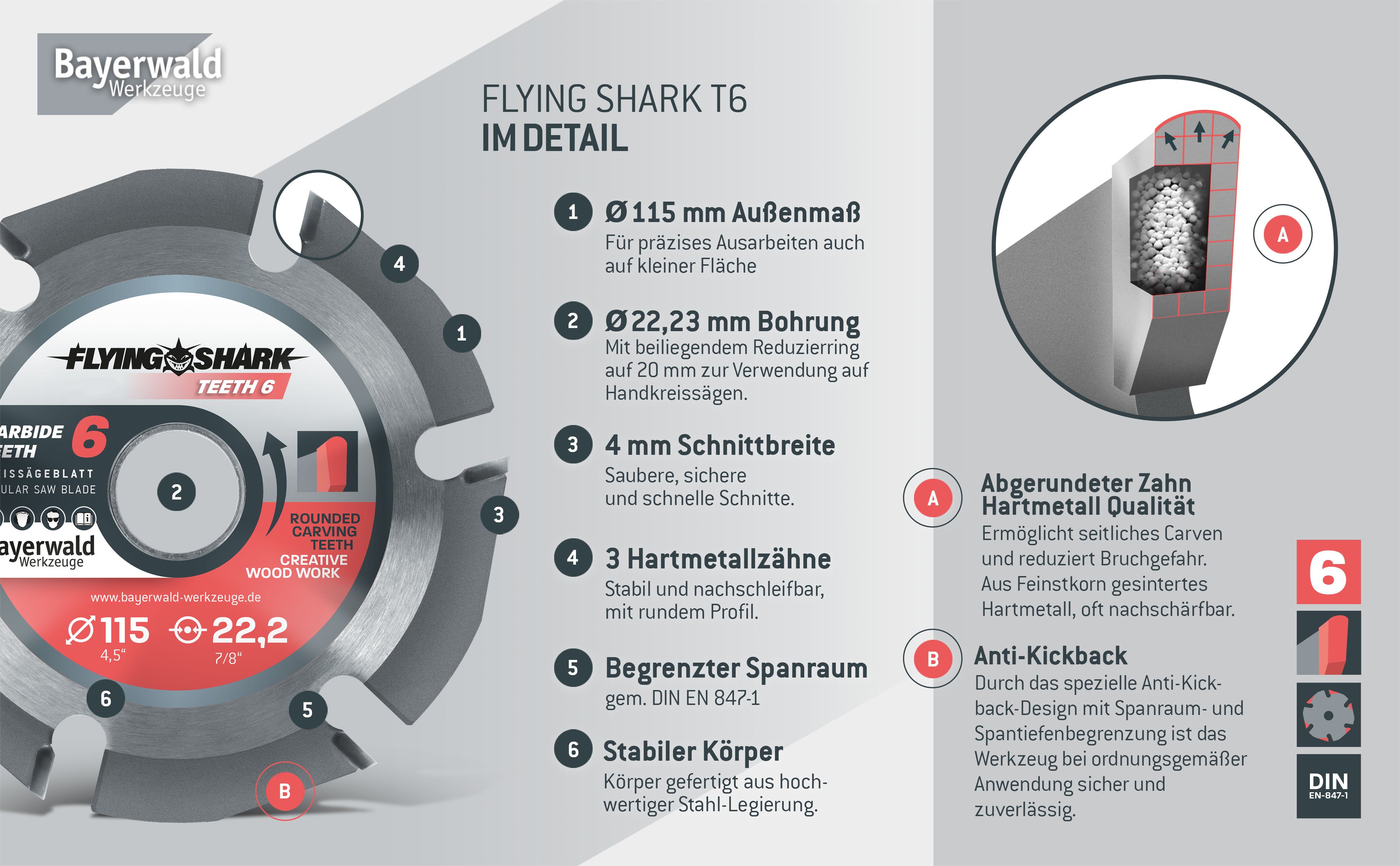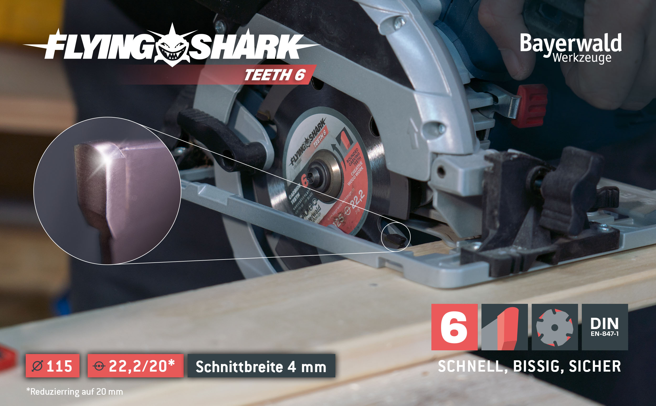 Der Raubfisch für Ihre Werkstatt: Der Flying Shark aus dem Hause Bayerwald ist speziell für Trennschnitte ausgelegt - er verfügt über 3 bzw. 6 Hartmetall-Zähne, welche durch ihre spezielle runde Form seitliches Carven ermöglichen und weniger bruchgefährdet sind als herkömmliche Zähne mit scharfen Kanten. Die Schnittbreite beträgt gerade einmal 4 mm – saubere, sichere und schnelle Schnitte sind so möglich.
