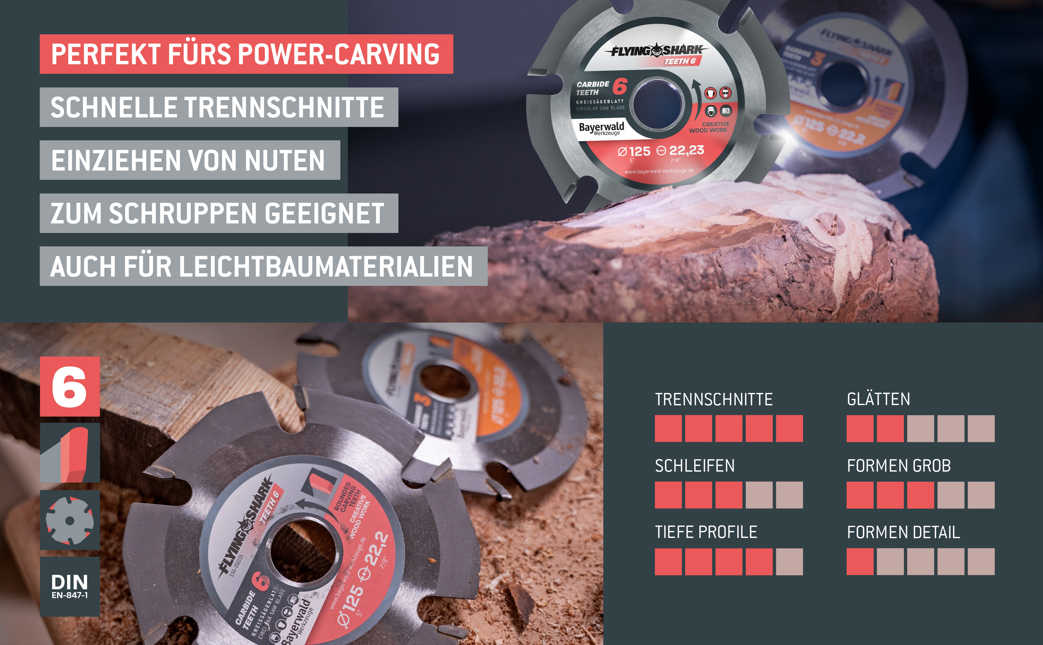 Mit dem Flying Shark lassen sich Holzwerkstoffe / Hart- und WeichholzLeichtbaumaterialen und Kunststoffe bearbeiten. Mit 3 Zähnen ist die Frässcheibe optimal für schnellste Trennschnitte und hohe Arbeitsgeschwindigkeiten geeignet, die Variante mit 6 Zähnen eignet sich perfekt für Power Carving mit größerem Materialabtrag.