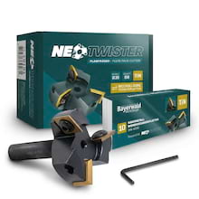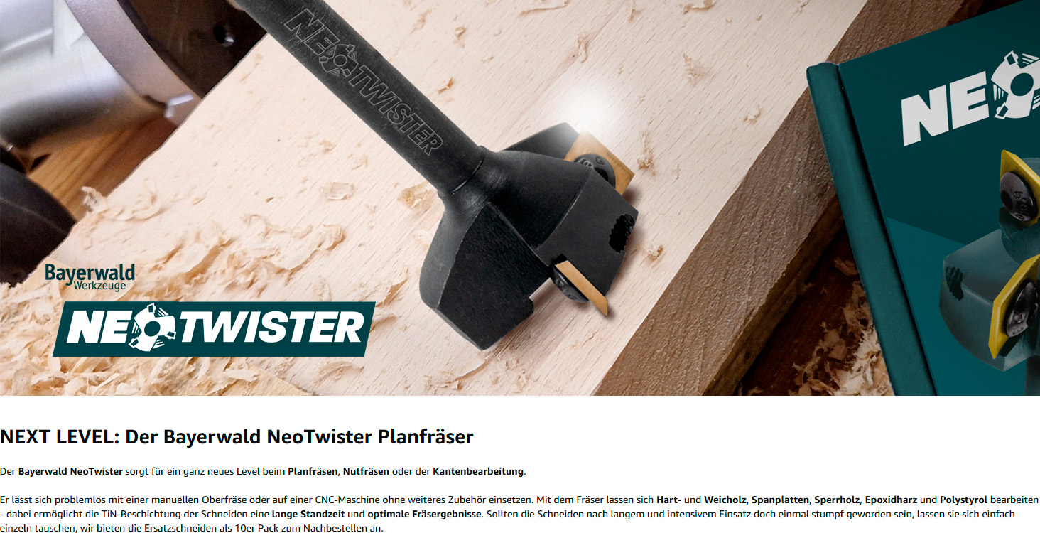 Der Bayerwald NeoTwister sorgt für ein ganz neues Level beim Planfräsen, Nutfräsen oder der Kantenbearbeitung. Er lässt sich problemlos mit einer manuellen Oberfräse oder auf einer CNC-Maschine ohne weiteres Zubehör einsetzen. Mit dem Fräser lassen sich Hart- und Weicholz, Spanplatten, Sperrholz, Epoxidharz und Polystyrol bearbeiten - dabei ermöglicht die TiN-Beschichtung der Schneiden eine lange Standzeit und optimale Fräsergebnisse. Sollten die Schneiden nach langem und intensivem Einsatz doch einmal stumpf geworden sein, lassen sie sich einfach einzeln tauschen, wir bieten die Ersatzschneiden als 10er Pack zum Nachbestellen an.