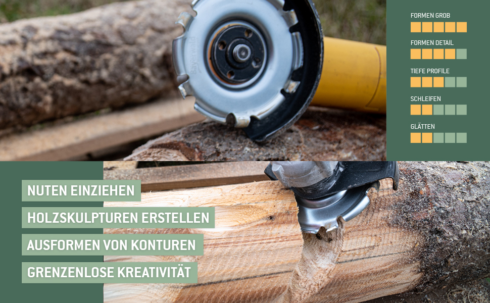 Der Bayerwald Woodcarver lässt sich auf den meisten handelsüblichen Winkelschleifern für 115-125 mm Scheiben verwenden. Beachten Sie bitte, dass der Woodcarver ausgelegt ist, um Naturhölzer zu bearbeiten, nicht für Platten- und Holzwerkstoffe!