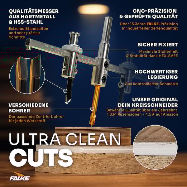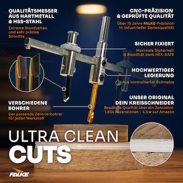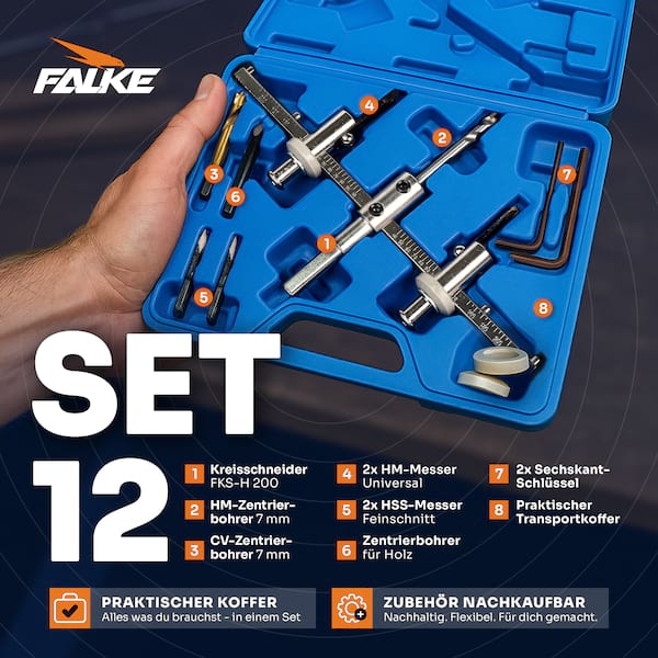 Falke Werkzeuge bietet mit seinen Kreisschneidern das ideale Werkzeug für Trockenbauer. Kreisschneider sind generell die ideale Alternative zur herkömmlichen Lochsäge, da diese das Bohren von Löchern verschiedenster Durchmesser ohne eine große Anzahl von Werkzeugen ermöglichen. Diese verstellbaren Lochsägen verfügen wahlweise über einen Schutzkorb, welcher sauberes Arbeiten ermöglicht und die abschließend nötige Reinigung auf ein Minimum reduziert.