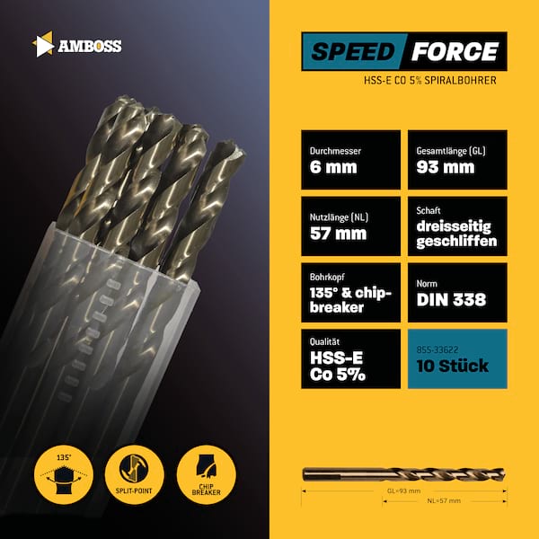 Die Speed Force HSS-ECo5 Bohrer von AMBOSS sind erste Wahl, wenn es um höchste Anforderungen an den Bohrer geht! Stähle bis 1200N/mm2 einschließlich rostfreien Stählen, alle Arten von Metallen, Kunststoffe und noch viel mehr können mit diesem Bohrer zuverlässig und wirtschaftlich bearbeitet werden. Zwei Spanbrecher-Nuten an der Spitze verleihen dem Bohrer eine unvergleichliche Geschwindigkeit, auch bei großen Bohrtiefen; der dreiseitig geschliffene Schaft sorgt für einen festen Sitz im Bohrfutter. Durchgeführte Tests mit Metallfacharbeitern haben diesen Bohrer als hervorragenden Performer bestätigt!