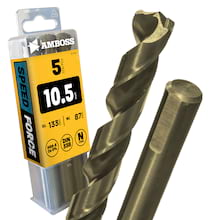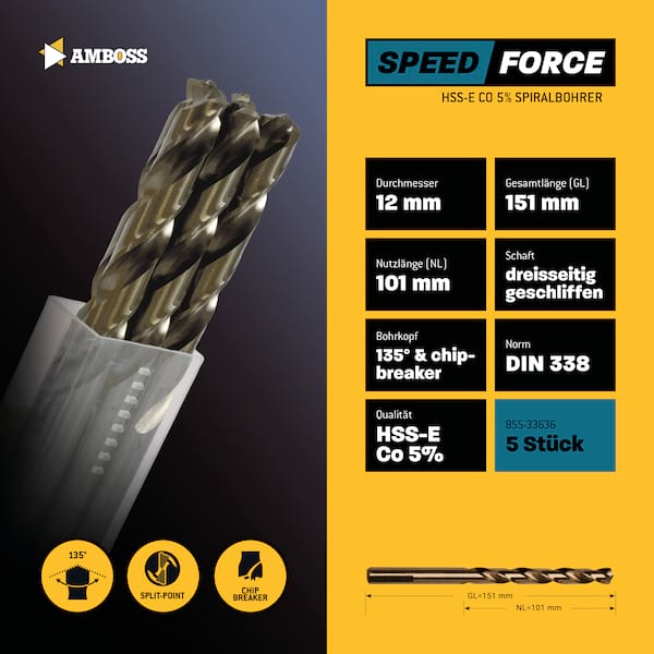 Die Speed Force HSS-ECo5 Bohrer von AMBOSS sind erste Wahl, wenn es um höchste Anforderungen an den Bohrer geht! Stähle bis 1200N/mm2 einschließlich rostfreien Stählen, alle Arten von Metallen, Kunststoffe und noch viel mehr können mit diesem Bohrer zuverlässig und wirtschaftlich bearbeitet werden. Zwei Spanbrecher-Nuten an der Spitze verleihen dem Bohrer eine unvergleichliche Geschwindigkeit, auch bei großen Bohrtiefen; der dreiseitig geschliffene Schaft sorgt für einen festen Sitz im Bohrfutter. Durchgeführte Tests mit Metallfacharbeitern haben diesen Bohrer als hervorragenden Performer bestätigt!
